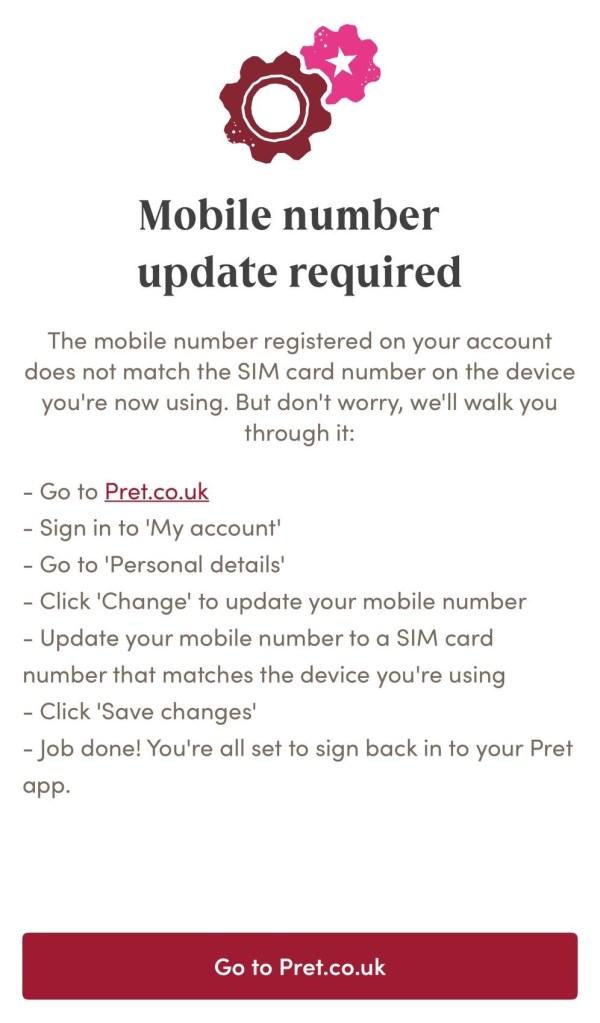 Regarding data issues, Pret have also continuously asked for new mobile numbers despite customers saying their registered number with the app is current and correct. But here is a new one that has even me shocked! Phone number versus SIM card AND device number!!!