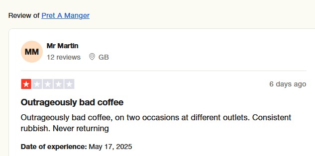 A recent complaint on the consistent bad coffee in Pret. (And 73% of customers on Trustpilot – 1 & 2 stars combined – dislike Pret as in end of May 2025).