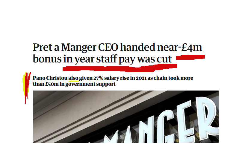 And of course we cannot compare a charity with a private business, but I still like to spill out that Pret A Manger CEO Pano Christou now gets about ยฃ500,000 annually plus ยฃ5 million in bonus if not more, while making cuts to staff left, right and center as well as draining tax payers, wage theft, coercing staff to work overtime without pay, “borrowing” money from staff (pay delays) etc. etc. etc.