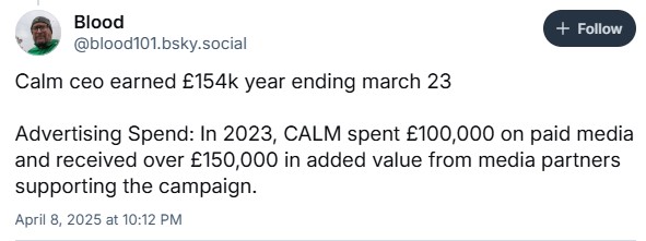 And it is astounding that a charity CEO gets roughly the same, or even MORE than UK Prime Minister. So, while the CALM CEO gets a juicy wage and probably bonus, his workforce live “miserably” as in not getting paid.
