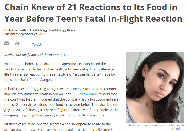 And not one mention that customers have gotten injured, some landing in hospital (before AND after Natasha died), like a man in New York who sued Pret after he also suffered anaphylactic shock from unlabelled sesame. The man lost the case as at the time (2015) sesame wasn’t mandatory listing in the USA like it was in Canada where the product came from. It was labelled on the box, but Pret didn’t feel the urgency to label it on the product or shelf, not even after they were sued. President Biden changed that. Sesame now must be labelled in the USA.