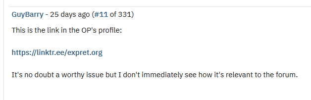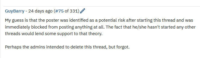 Link to the thread I started which they limited and hid all the 300+ comments when I am logged in. The thread is locked for me when I’m logged in. When logged in, I can only see my initial post. When logged out I can see all the comments. GuyBarry seemed to have been obsessed for me to respond: