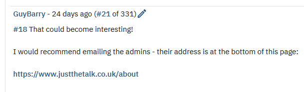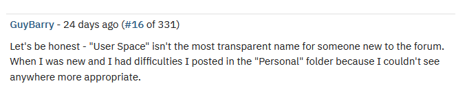 I won’t post the whole thread, people can just click on above link unless they delete it. My response must have stepped on some retired toes. GuyBarry did a U-turn pretty quickly and put the boss-hat on. He also seems to purposely misunderstand my query in how to reply to individual posts, turning it into a “private” messaging thing to be able to tell me that his email address in on his profile. No thanks, dude.