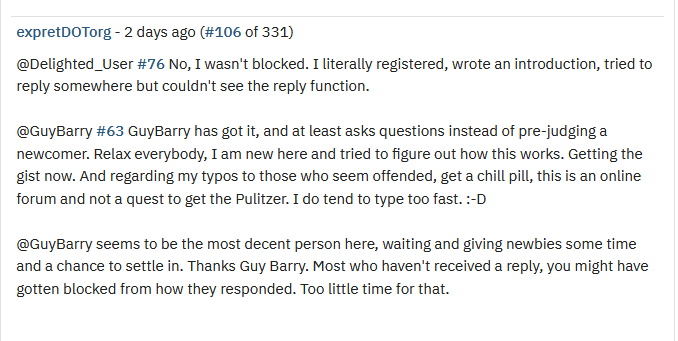 I started answering many users, not all, but those who where normal like saying welcome, those who didn’t understand my question, and also GuyBarry. I complimented him as coming across the nicest on this thread where many posted cynical comments.