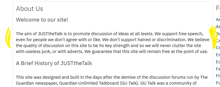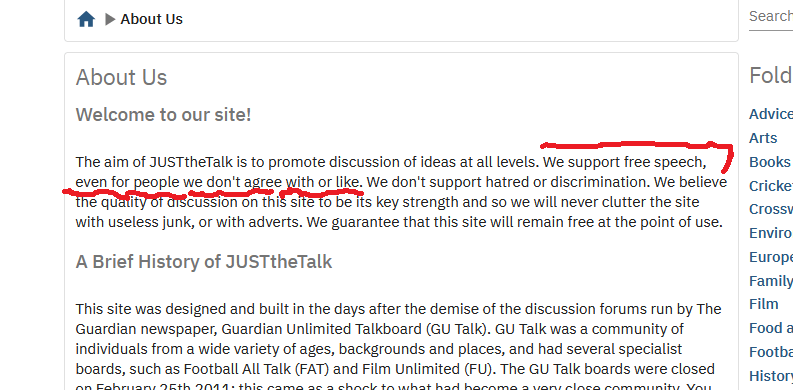 I did find the first sentences odd, because on professionally run social media or forum platforms, the text usually says something like, โWe support free speech but not discrimination, racism, sexism, hate speech โฆ etc.โ A more broader and detailed clarification. But with JustTheTalk (JTT) they make it personal, for a lack of a better word. They say, โwe support free speech โฆ even for people we don’t like.โ
