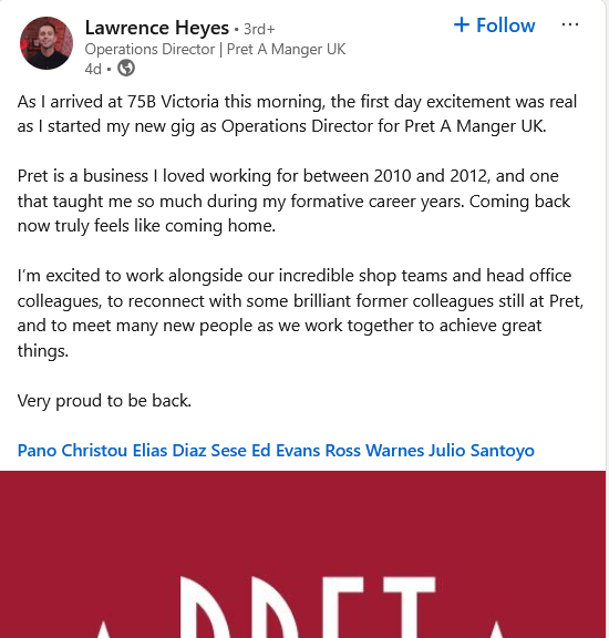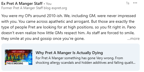 I worked at Pret A Manger and survived systemic workplace bullying during bereavement that involved HR, the top leadership, HQ and even the now “retired” former CEO Clive Schlee. Schlee has been appointed CEO of itsu in 2024 by Julian Metcalfe who gave him the CEO spot at Pret many years ago.