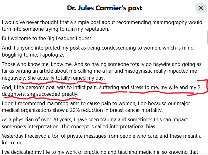 “I would’ve never thought that a simple post about recommending mammography would turn into someone trying to ruin my reputation.