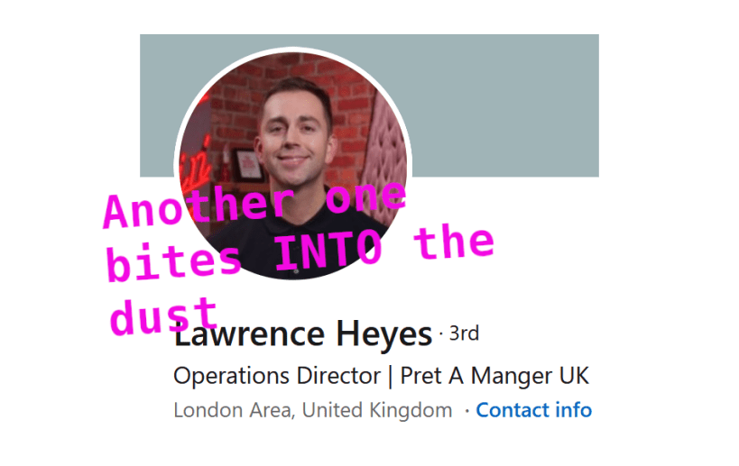 They live and move in such a bubble, for years having gotten away with lies and BS. Not even customer deaths and multiple criticism, bad press and bad staff reviews faze them. “Them” as in Pret and itsu, as in Julian Metcafe, Clive Schlee, Pano Christou, David Carter, Andrea Wareham, Lila Warren etc. etc. etc.