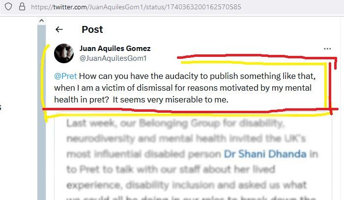 Please scroll up in the following X feed where a former staff with mental health problems calls you out after Dr. Dhanda spoke in your company. Quote by Juan Aquiles Gomez: “How can you have the audacity to publish something like that, when I am a victim of dismissal for reasons motivated by my mental health in pret? It seems very miserable to me.”
