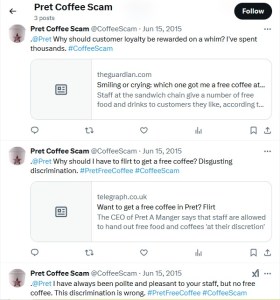 Someone in 2015 even briefly started a “Pret Coffee Scam” aacount regarding the freebie discrimination. Only 3 posts.