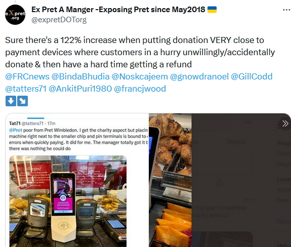 Another issue that was briefly reported on was that Pret’s donation increased by 122%. Again, misleading success because the donations came in many times due to the donation devices being VERY close, right next to the payment devices. Many customers by accident and in the noisy rush tapped the donation devices to pay for their food/drink and then donated ยฃ5 to the Pret Foundation (for tax breaks and brownie points with the public).