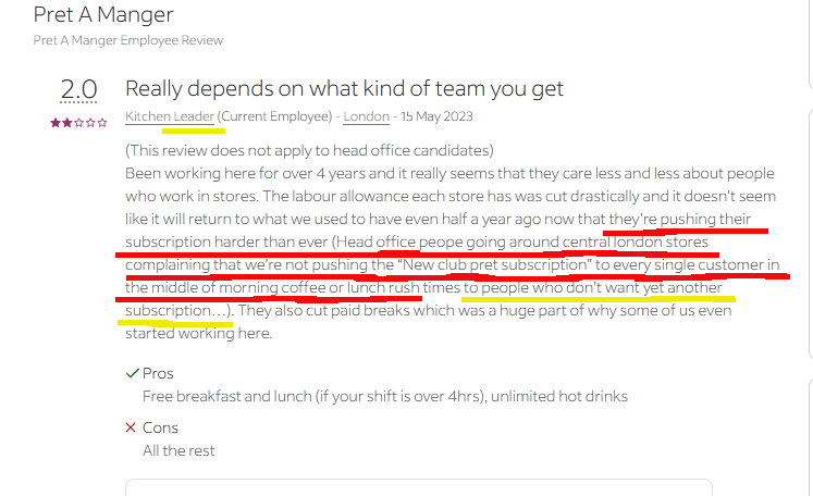 Indeed (verbatim, I leave mistakes in): “theyโre pushing their subscription harder than ever (Head office peope going around central london stores complaining that weโre not pushing the โNew club pret subscriptionโ to every single customer in the middle of morning coffee or lunch rush times to people who donโt want yet another subscriptionโฆ).”