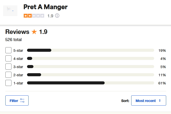 And 61% of customer on Trustpilot give one star reviews, 11% two stars and only 19% approve of Pret. It’s actually 72% who are very unhappy customers with the 1 and 2 stars combined. Many having vowed to never set foot inside Pret again. The complaints are on a variety of issues, the main issues being higher prices for lesser quality products, the coffee subscription has a lot of complaints, and dirty shops, rude staff etc.