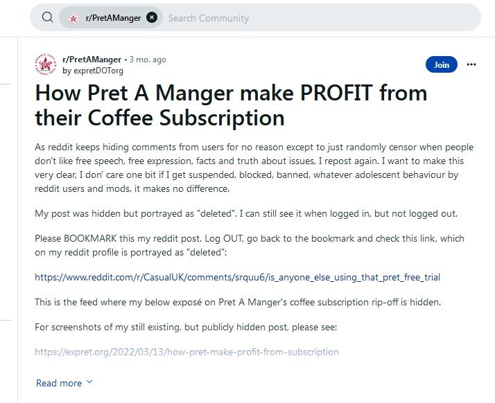 In early 2022 I wrote a reddit post on how Pret make profit through their coffee subscription. This year reddit hid my post, while I can still see it when logged in, others can’t. The typical reddit over-extreme censorship by power-tripping moderators of subreddits who can’t stand when people write with extensive knowledge. Their insecure little selfs need to silence anyone for no reason while putting complicated “rules” in place that are easy to break. Or even when rules are not broken,they just come up with reasons why they ban people. It’s become so normal that I always expect being banned, therefore I don’t even read the rules anymore. ๐