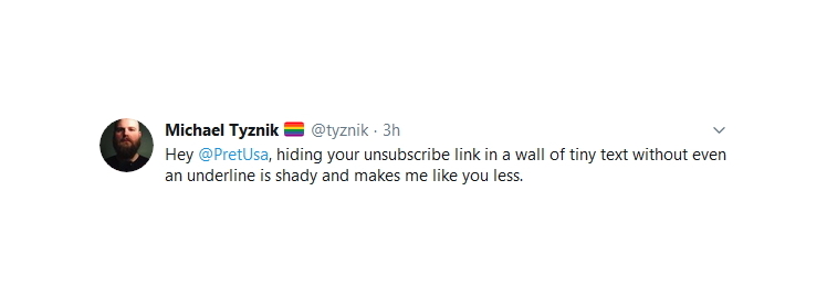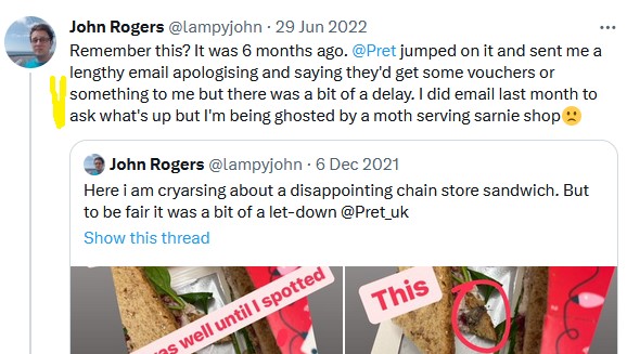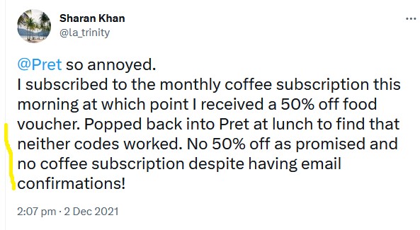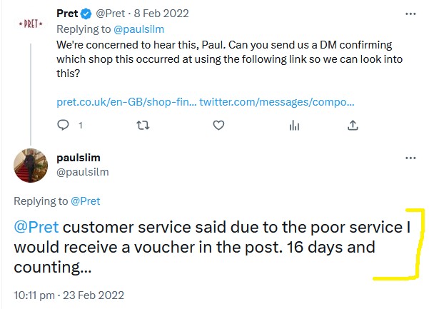 And then customers run to Twitter with pictures of half full cappuccinos, missing cream, lukewarm coffees…! There’s nothing more dehumanizing at a workplace that I have experienced. And should anyone suffer from boredom, do an experiment and just read through some Pret Tweets a few minutes each day for a week, with the same sweet-talk response from Pret veering customers away from public Tweets to private DM.