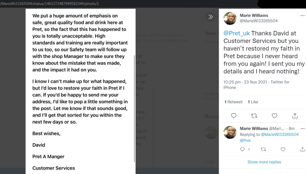 Some complaints are legitimate when a customer already spoke to the manager, and yet Pret has a DM button, but customers feel the public needs to be aware of their dilemma in Pret shops. I know, I know I respond a lot to some Tweets, and maybe it is because for 10 years I had to bite my tongue towards rude customers, I take the opportunity now to give my opinion. And Pret doesn’t block me as they collect my Tweets in case for court and certainly to learn some tips, as I have showered them with suggestions for improvement while I worked there. Be my guest, Pret.