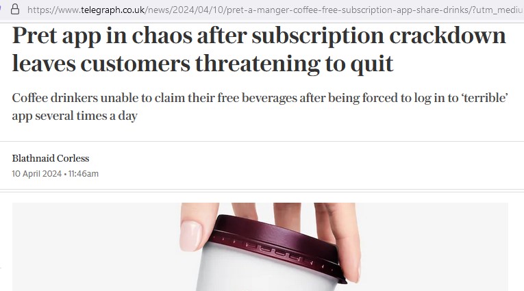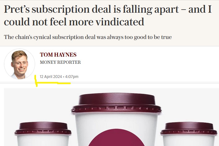 15, April 2024 – Reminder of the BBC article I and journalist Mike Powell worked on that got the ball rolling on Pret’s subscription, which is often referenced in the Telegraph articles without crediting.