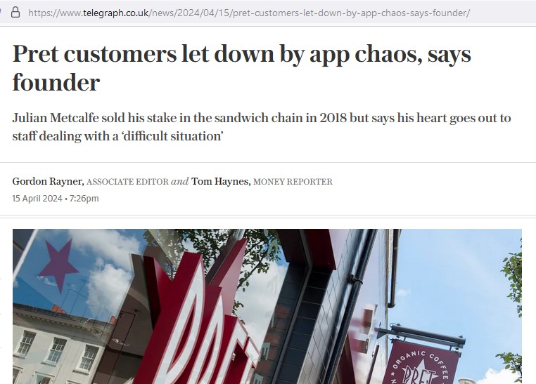 The following is one of several articles around mid April 2024 that puts Julian Metcalfe in a positive light since the Pret app debacle. Here it seems the Telegraph is “siding” with Metcalfe while throwing Pret under the bus! Not sure if Metcalfe has connections to the Telegraph as he seems to be put to the forefront, while Pret are send to the naughty corner.