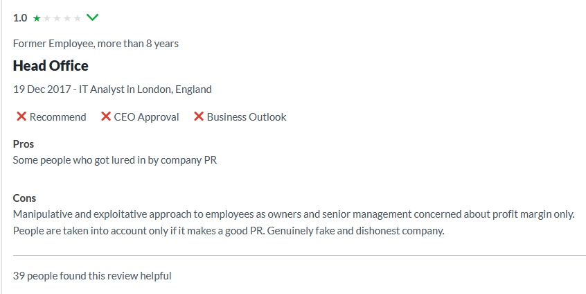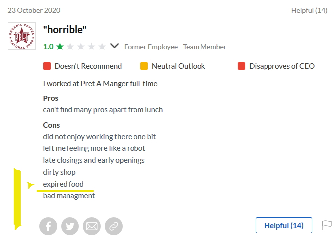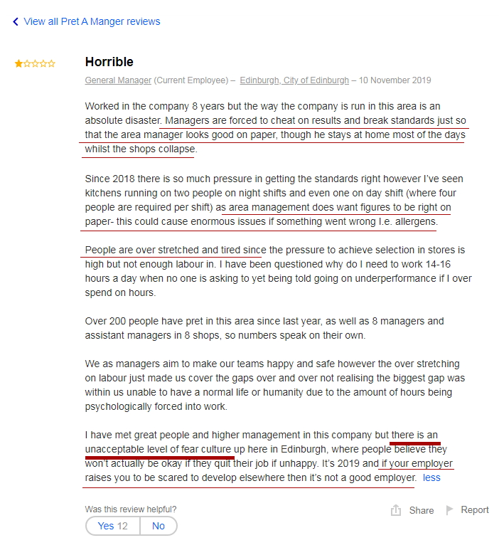 And for those who don’t like reading long blog entries, get the popcorn out and put the kettle on, a small collection from the “core target audience’s words of mouth” of what many, many other current and former Pret staff say throughout the years, from different countries (including Pret’s London HQ staff) on review sites, Twitter, YouTube, Facebook etc.