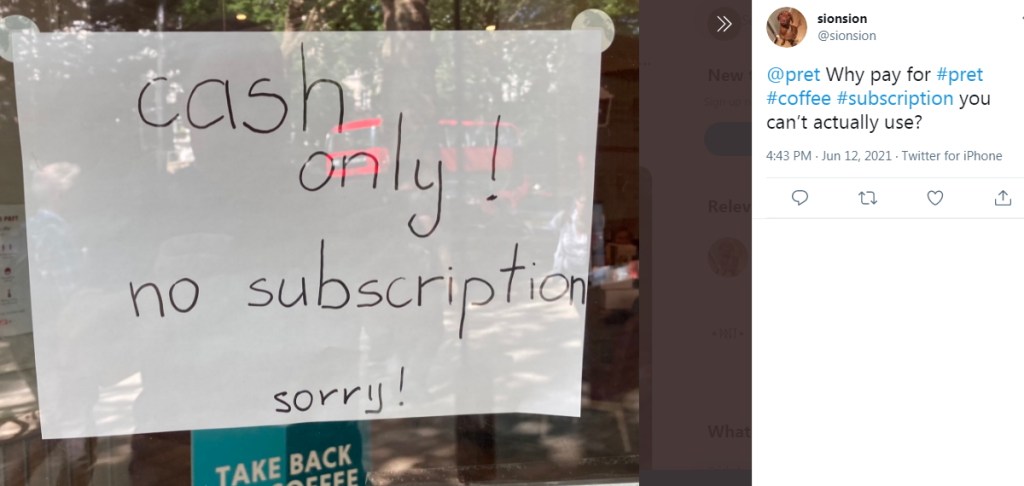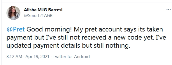 People either can’t cancel, can’t log in, don’t get a confirmation email, don’t get a response when emailing Pret (except when publicly tweeting), having various “technical” issues and a dozen other reasons why they can’t cancel. And if they manage to cancel before the expiry/renewal date, following all the terms and conditions, they are still getting charged the following month as if they’ve never cancelled. Coincidence? ๐