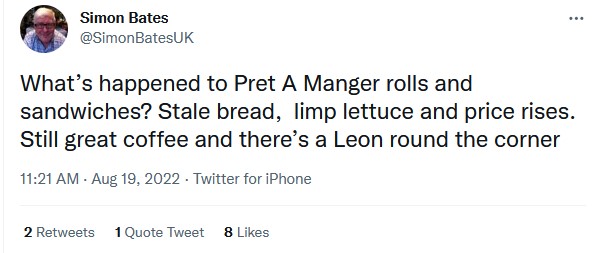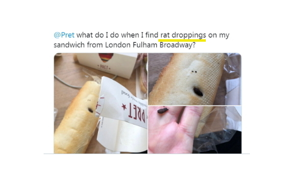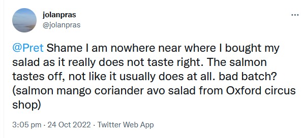 Food quality has decreased a great deal already during the pandemic with customers flocking to social media posting photos of mouldy sandwiches, even rat dropping on a baguette. Reports on food poisoning has also increased. The latest even from today 01. August 2022. I posted more photos on Pret food is not fresh. Check the dates of the posts.