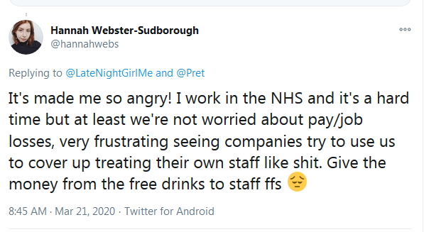 As Pret is very customer (money) focused like most big companies and portraying to the public to be an ethical and caring company for their employees, the very opposite is the case. A wise word I stumbled across once on Twitter:
