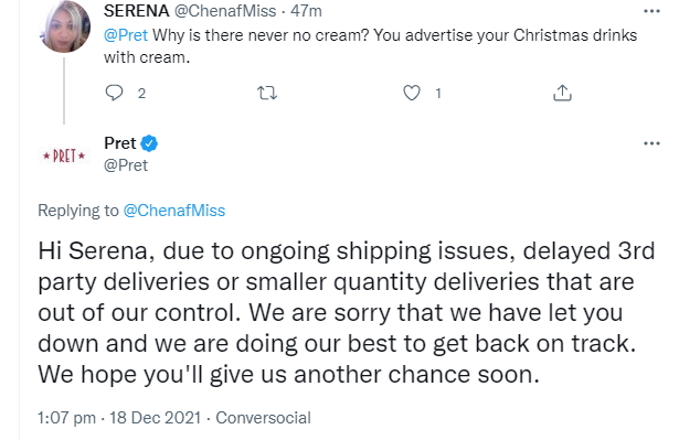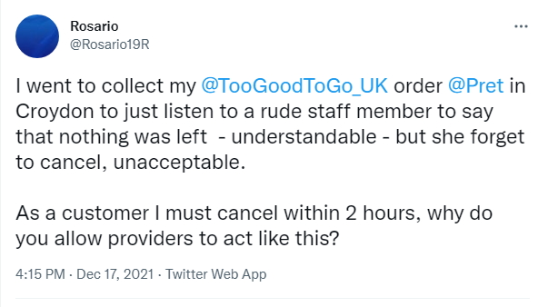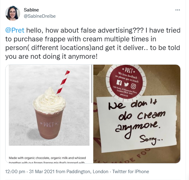 In one Tweet a customer has even cancelled TWICE and Pret still keeps drawing money out of their bank account, or someone contacted Pret 4 times without a response, and then went on Twitter in public.