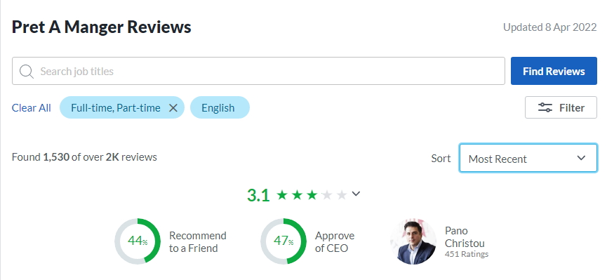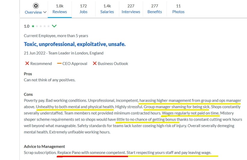 But a few reviews I found from recently which I want to put here, as work conditions have worsened to an unbelievable level of carelessness by Pret and current CEO Pano Christou. Pret delayed paying staff TWICE this year under bogus excuses, the second time during the Queen’s Jubilee weekend knowing that the public would be distracted and banks closed on bank holiday Monday.