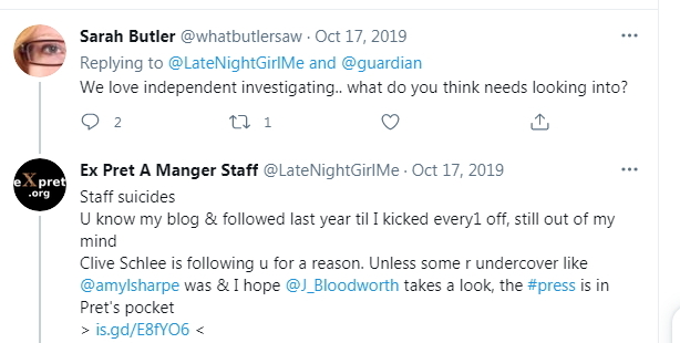 (She was at the Coxton branch of Pret when former CEO Clive Schlee pointed to me, saying to her that I was his โlate night girlโ after my emailing and Pret taking the mick. Full story at the bottom audio player).