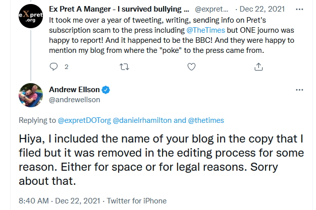 And David Carter made 3 offers of settlements if I resign from Pret and never speak about my ordeal nor go to court. The fourth settlement offer came via ACAS when I withdrew my Tribunal claim against Pret, because my dad died at the time of preparing.