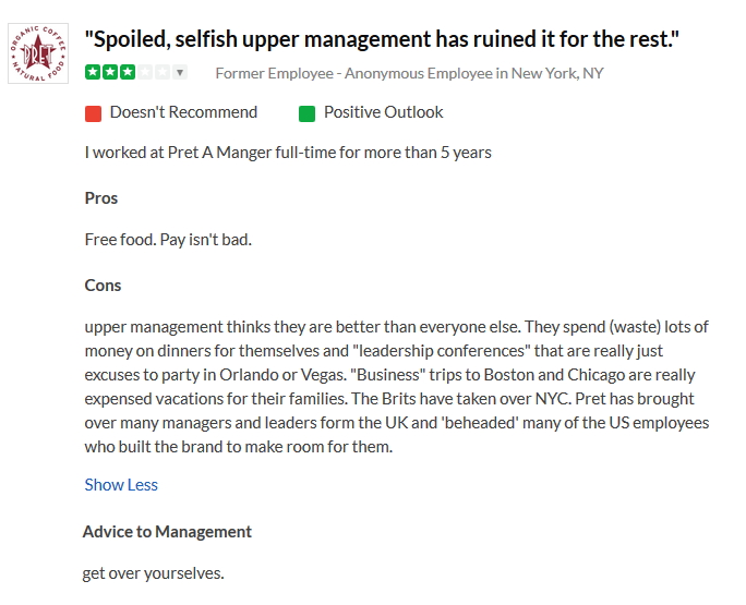 I became obsessed and sieved through Glassdoor, Indeed and the Internet in general, on a search for others who know Pret as a toxic company that fooled the public for decades with a caring and ethical facade, while the total opposite is the case.