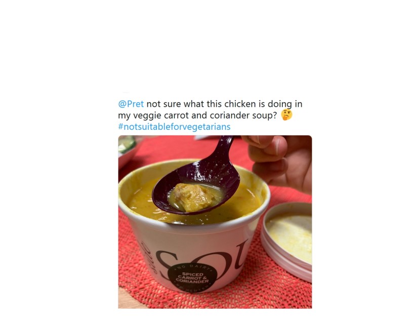 Below is a series of more customer complaints of half empty coffees, un-stirred hot chocolates, poor coffee quality, chicken instead of vegan soup, pork instead of veggie pot, stingy ingredients in wraps, wrongly labelled … These are just a small collection here of those people care to go on Twitter with photos. I stopped updating, but the issues continue.